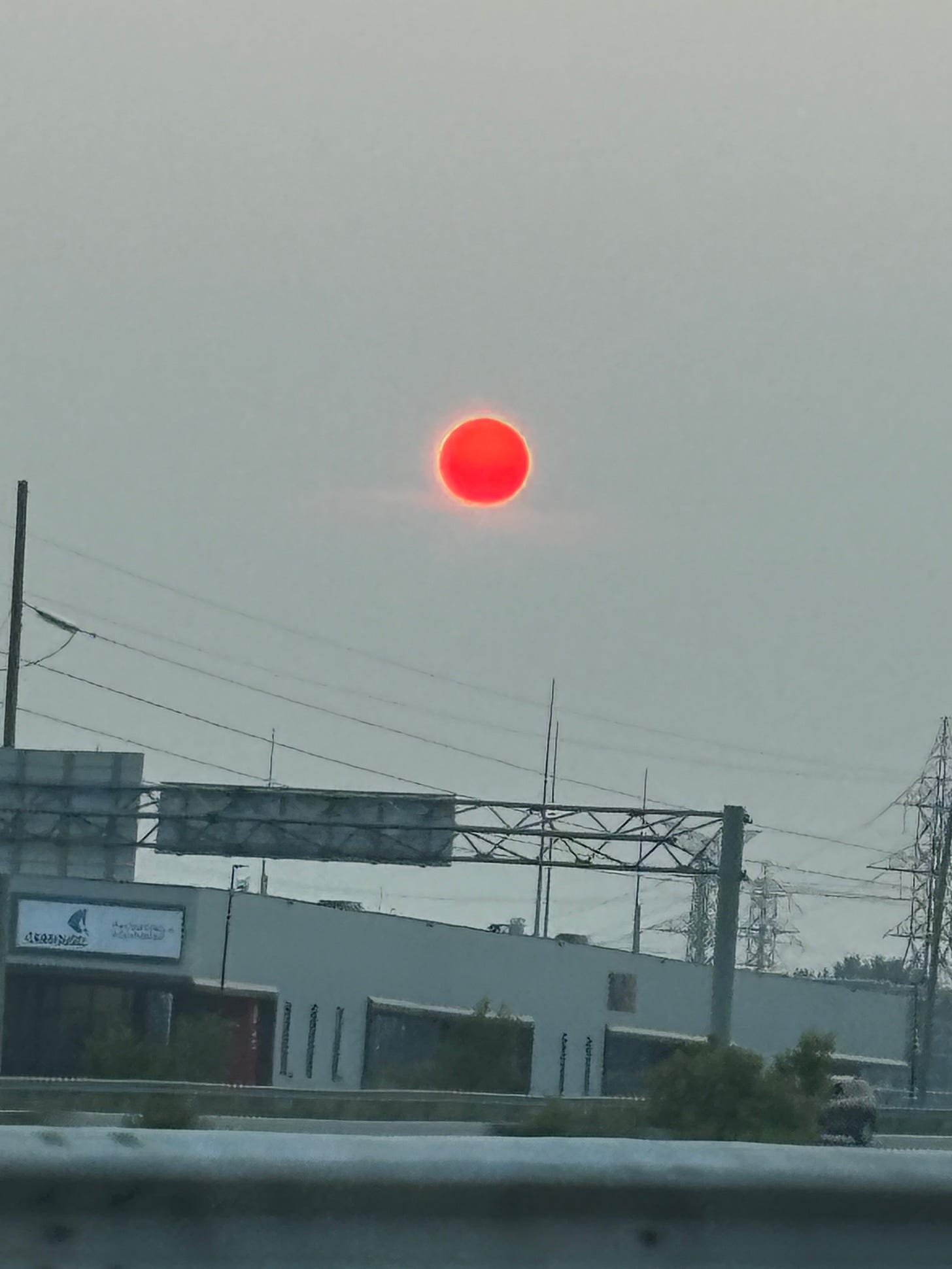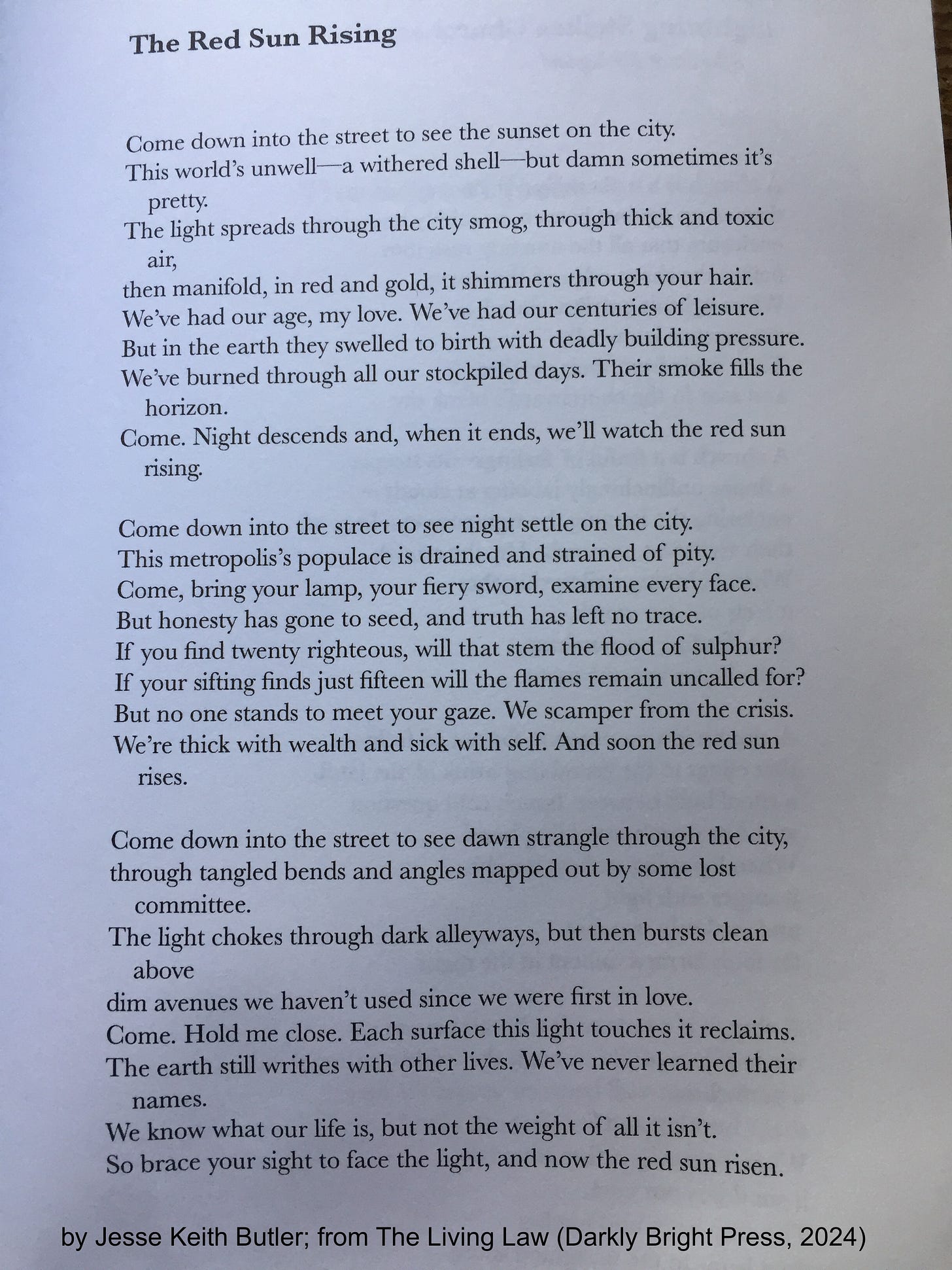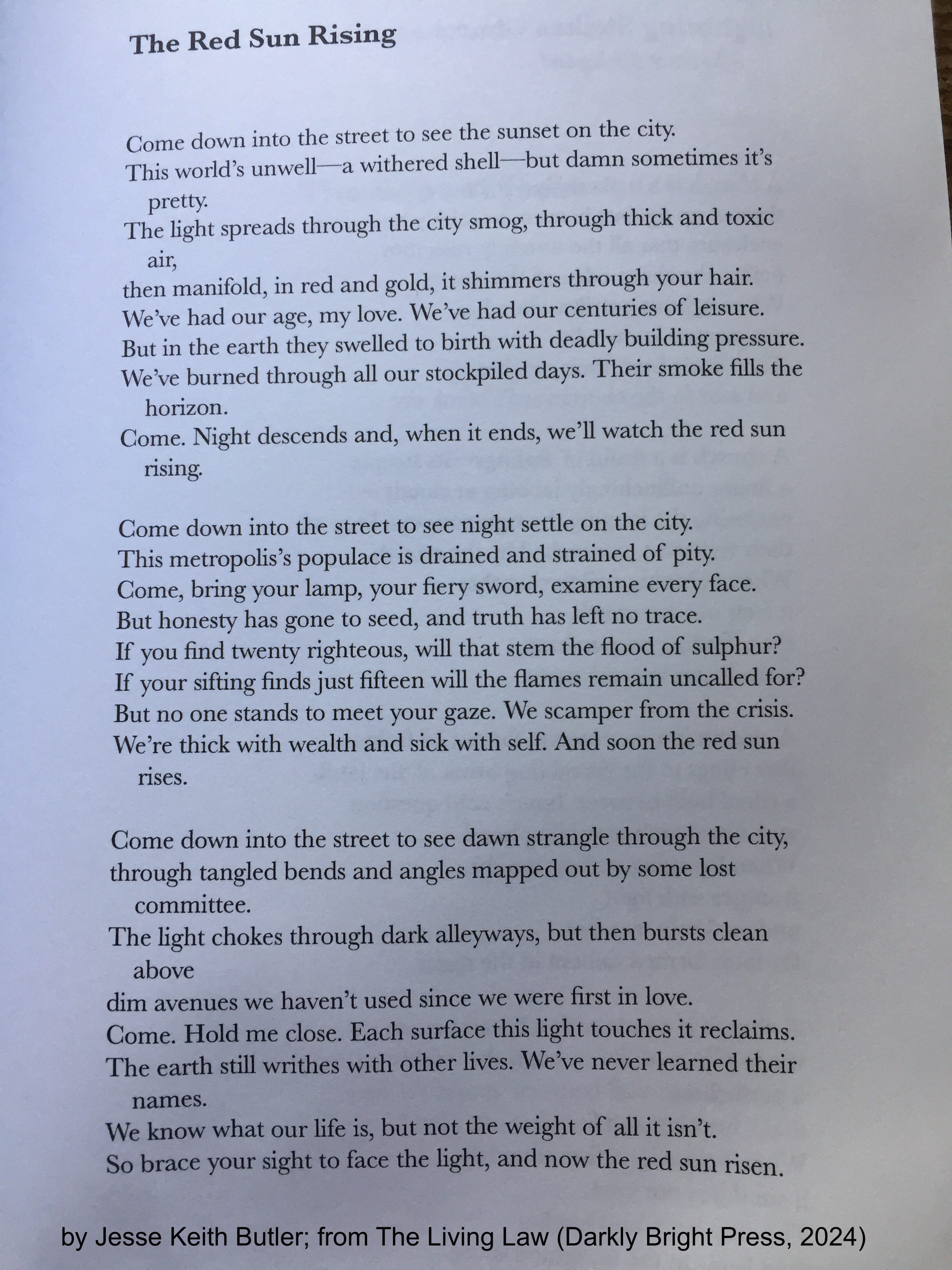 One more poem. “The Red Sun Rising” is in The Living Law, but hasn’t ever appeared online. It’s a weird apocalyptic poem I wrote many years ago when I was trying to start an ill-fated hip-hop/country/punk band. I’ve been thinking about it a lot through the recent wildfire season, so I thought I’d share it here, along with a picture my wife took of a very red sun through the wildfire smoke. Thanks to all of you for reading. Until next time, stay safe out there.