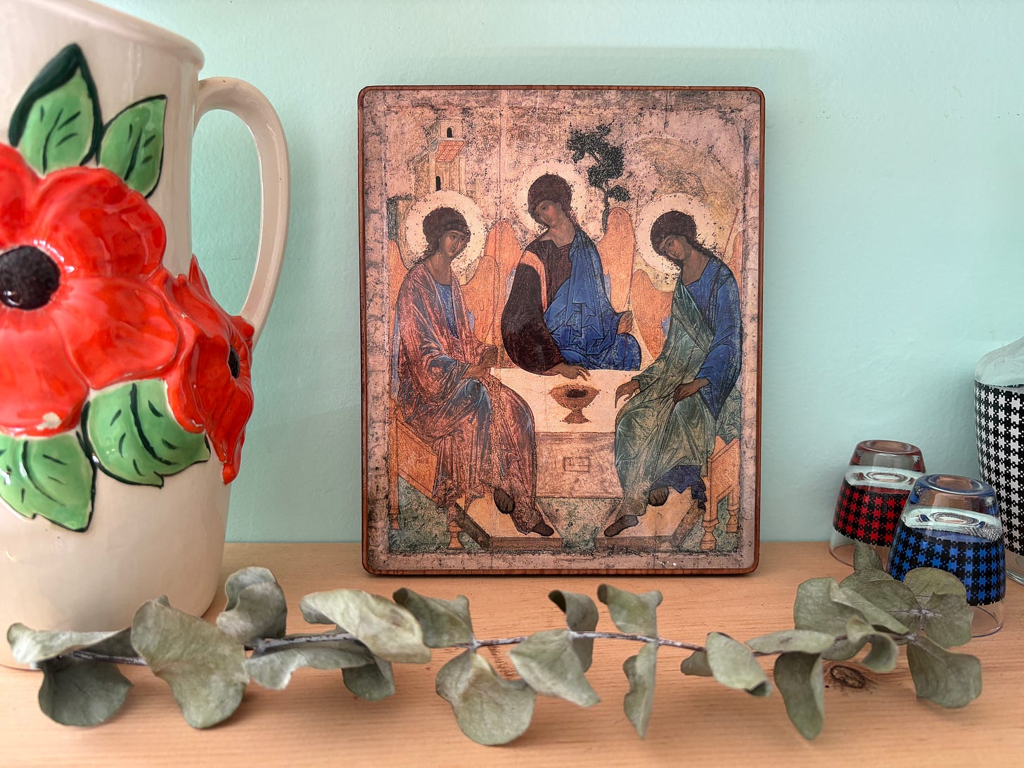 It’s a bit uncanny how Daniel gets inside my nonlinear thought process in this passage, and the rest of the review is equally insightful. (The review is only available in print, but you can check out the rest in a copy of Arc Poetry 104.) The poem he’s discussing here, “Hospitality,” is only available in its final form in my book, but an early version of the first third of the poem, which dramatizes Abraham’s hospitality when visited by God, can be found here. If you’re not familiar with Rublev’s Hospitality icon, which portrays the three angels who visited Abraham as a representation of the Trinity, here’s a picture of a picture of it from our kitchen: